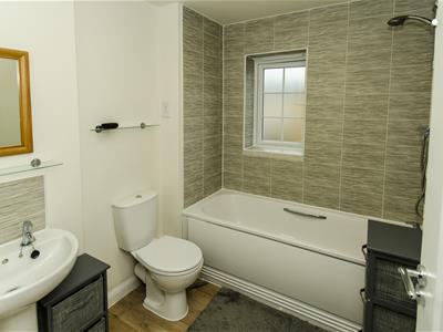 Upstairs, the first floor provides three well-proportioned bedrooms, including a comfortable main bedroom, two further bedrooms ideal for children or home working, and a neatly appointed family bathroom with shower over the bath.