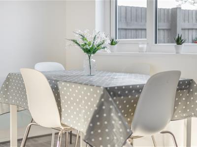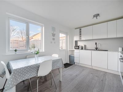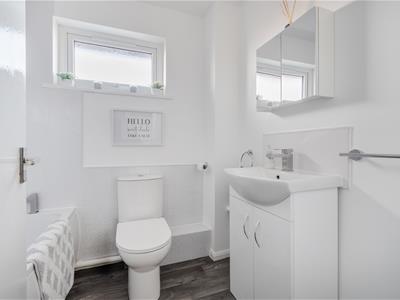 On the ground floor, an entrance lobby opens through to a good sized living room, with stairs up to the first floor, a useful understairs recess and a door through to the wonderful updated kitchen/dining room. This features a range of sleek modern wall and base cupboards with adjoining marble effect worktops. There is an electric oven and 4 ring hob with an integrated fridge/freezer and a washing machine. There is wood effect vinyl flooring and a door to the garden. On the first floor, Bedroom 1 is a decent sized double and has a built in cupboard. A further bedroom and the refitted bathroom complete the layout.