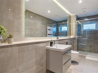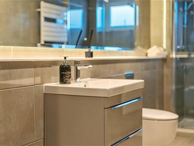 The bathroom is finished to an impeccable standard, showcasing Porcelanosa tiling, a contemporary shower enclosure, and a sleek 600mm vanity unit with wash basin.