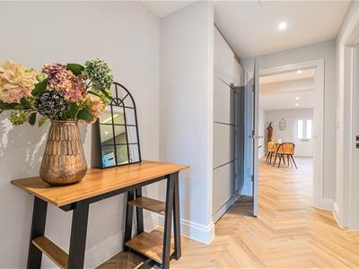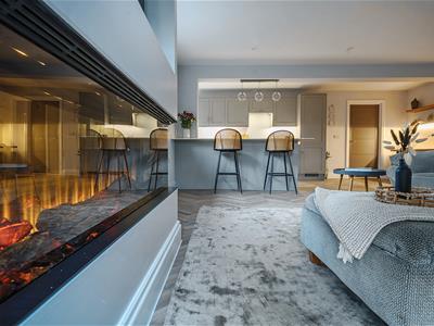 Flat 9 is accessed via a private west-facing entrance, the apartment opens into an impressive open-plan kitchen and living space designed for both comfort and style. A bespoke media wall forms a striking focal point, complemented by a Dimplex Ignite Ultra electric fireplace with Optiflame technology, creating an elegant yet inviting atmosphere.