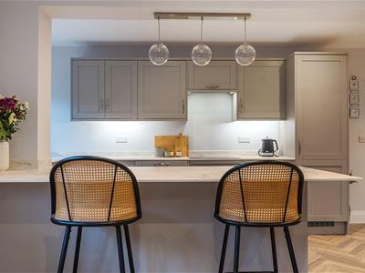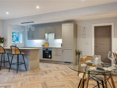 The designer kitchen is fully fitted and centred around a stylish breakfast bar, featuring a full suite of integrated appliances including hob, oven, fridge/freezer, dishwasher, and washing machine, alongside a separate utility area for added practicality.