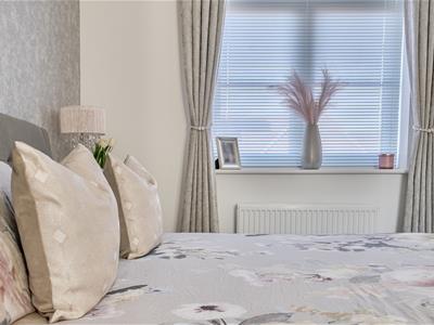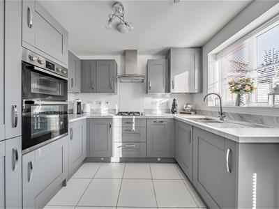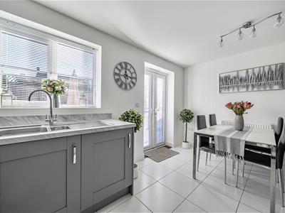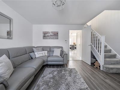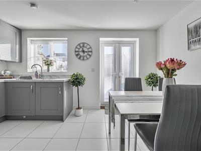 Built in 2021 and owned since new, the current owners present the house beautifully with elegantly decorated rooms. A cosy sitting room leads through to a delightful 14ft open plan kitchen/dining room with large ceramic floor tiles, light worktops and a good number of wall and base cupboards providing plenty of storage, and low level plinth lighting. The kitchen is well equipped with an integrated fridge/freezer, washing machine, built-in eye level oven and grill and 4 ring gas hob. There is also a useful downstairs cloakroom.