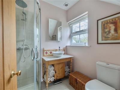 The well-planned accommodation comprises an entrance hall, a dual-aspect sitting room with views over the gardens, a separate dining room, and a spacious 20’ kitchen/breakfast room with underfloor heating, electric oven, and ceramic hob. These principal living areas are flooded with natural light and provide an excellent setting for both everyday family life and entertaining. A utility room and a guest cloakroom with shower complete the ground floor.