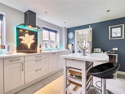 The ground floor is entered via a porch into a central hallway. The main reception room is situated to the left of the entrance hall and provides a spacious and comfortable living area. To the rear, the modern kitchen is well arranged and fitted with an integral dishwasher, hob and oven. The kitchen opens through to a separate dining room, with a conservatory beyond providing an additional reception space overlooking the garden. A useful utility room offers further storage and work space, with access both to the garden and to a downstairs shower room, making this a practical layout for family living.