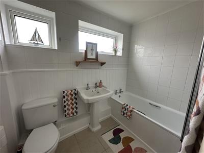 Upstairs features two double bedrooms, a third room ideal as a nursery or home office, and a bathroom fitted with a white suite.