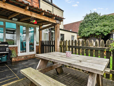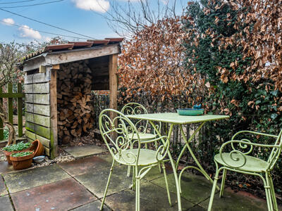 Externally, the property benefits from off-road parking for up to three vehicles to the front, as well as a gated courtyard garden with wood store. To the rear, a covered sun terrace leads down to two separate lawned garden areas, complemented by useful outside storage and a block-built shed.