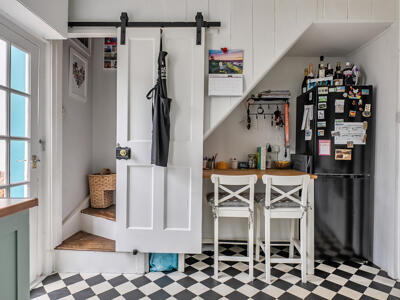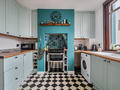 Offering over 900 sq ft of accommodation arranged across three floors, the home begins with a practical entrance lobby featuring tiled flooring and space for coats and wellies. This opens into a characterful sitting room with wooden flooring and an inviting log-burning stove set within an exposed brick fireplace. A country cottage–style kitchen provides a good range of modern fitted cupboards and space for appliances. Beyond this, a versatile garden room offers flexibility as a dining area or utility space, with French doors opening directly onto the garden.