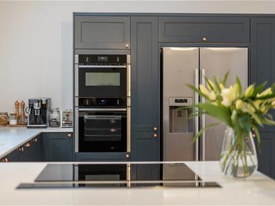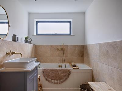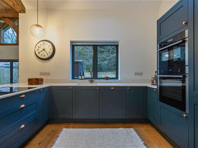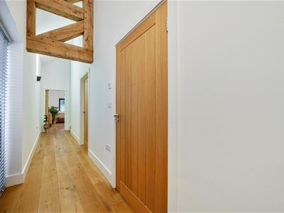 The social hub of the home is an impressive open-plan kitchen, dining, and living area with vaulted ceilings and striking oak beams. A glazed oak gable and full-width bi-fold doors flood the space with natural light, creating a seamless connection to the landscaped rear garden. The bespoke solid-oak, hand-painted kitchen features quartz-surface worktops, a full range of integrated Neff appliances, and a separate utility room for added convenience. To the opposite side of the ground floor, a spacious principal bedroom boasts a second vaulted, oak-beamed ceiling with glazed gable, bespoke fitted wardrobes, and a luxurious en-suite shower room fitted with Villeroy & Boch and Crosswater fixtures. A beautifully long hallway joins the bedroom to the living space, with two further double bedrooms and a well-appointed family bathroom complete with both bath and separate shower.