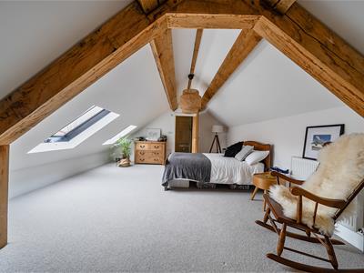 The top floor provides an impressive guest or principal suite, featuring exposed beams, a walk-in wardrobe, and a high-quality en-suite shower room fitted with Villeroy & Boch, Porcelanosa, and Lusso Stone fittings.