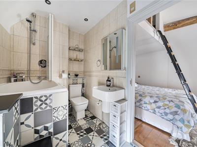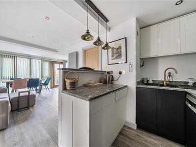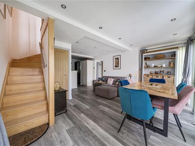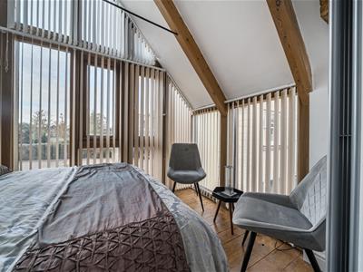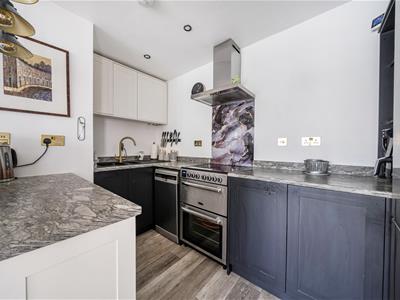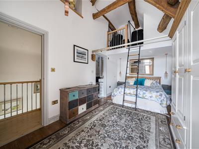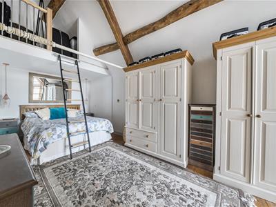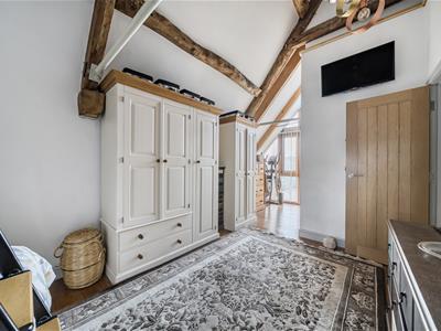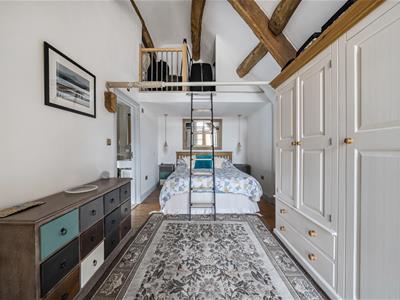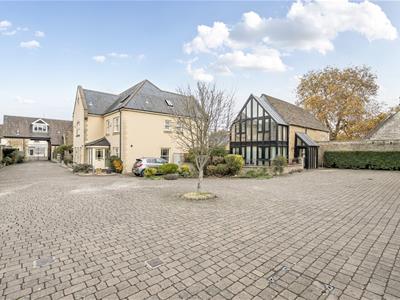 Located in an exclusive gated Mews development in the heart of Corsham, this delightful 2 bedroom period barn has fantastic features. Viewings strictly by appointment and rarely available to the market the property is accessed through a hard wood timber framed porch on the side of the property leading to the open plan ground floor. The well thought out kitchen maximises the space available and is fitted with a range of shaker style wall and base units with Brazilian river stone granite work tops, space for a dishwasher and cooker. Wood effect flooring runs throughout the ground floor. Off the living area is a stylish shower room with attractive patterned floor tiles and a deluxe cubicle shower with rain shower, radio and steam feature and cupboards housing the central heating boiler and space for a washer dryer. The main living area has feature floor to ceiling hardwood windows and door dominating the front aspect. There are two storage cupboards under the wooden staircase which leads to the first floor landing with access to two bedrooms. Both bedrooms have pine floor boards and hardwood windows from floor to vaulted ceiling to the front and side with exposed wall ties, exposed ceiling beams and pine floors. The main bedroom is a good size and has many lovely features, with a vaulted ceiling and stunning A frame roof trusses dating from the 1700's. There is a mezzanine area which includes a stylish removable ladder, ideal for storage. The ensuite features a stone mullion window to the side and attractive tiles and flooring. The fitted white suite includes a Japanese style deep soaker bath and shower with a storage cupboard behind a sliding door. The property is double glazed and warmed by mains gas heating and Nest learning thermostat, all internal doors are oak. Externally to the front there is a walled courtyard and planted area beyond topped with railing, bushes and shrubs. To the side is the allocated parking space with a charging point for an electric car.