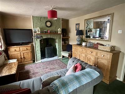 The ground floor includes a sitting room with fireplace and wood-burning stove, and an extended kitchen/dining room overlooking the garden. The first floor offers the main bedroom and bathroom, with two further bedrooms on the top floor.