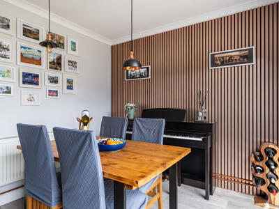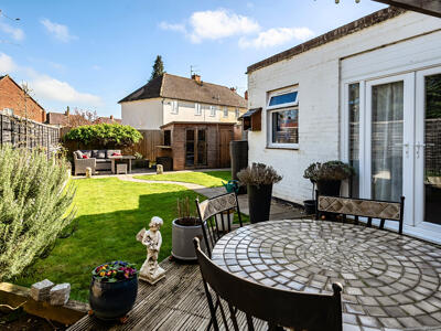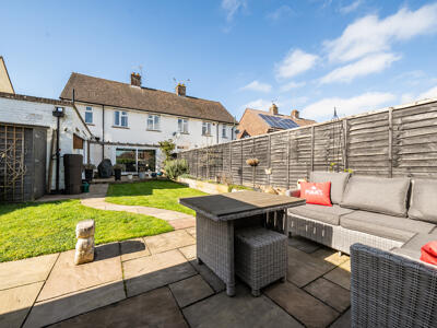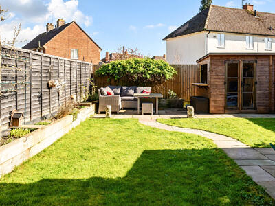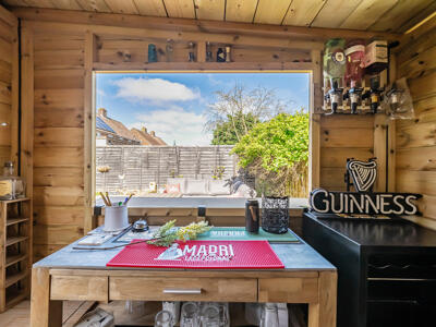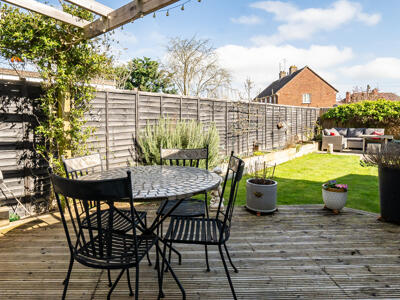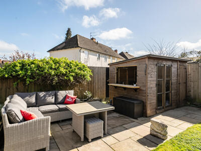 Outside, the property benefits from driveway parking for up to three vehicles. The private, south-east facing rear garden is thoughtfully landscaped, featuring a decked sun terrace with pergola—ideal for outdoor dining and entertaining. An Indian sandstone pathway winds through the garden, leading to a secluded patio seating area. A charming summerhouse, complete with light and power, includes a convenient drop-down bar and is complemented by an attached garden store. The garden also boasts an espalier pear tree, a well-maintained lawn, a raised planted border, and a side access gate, creating a practical yet attractive outdoor space.