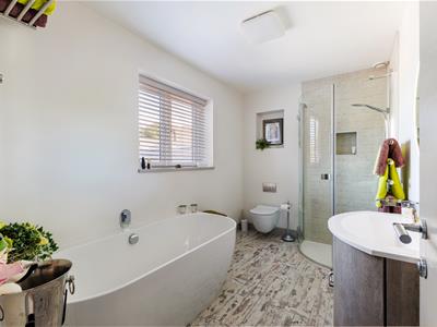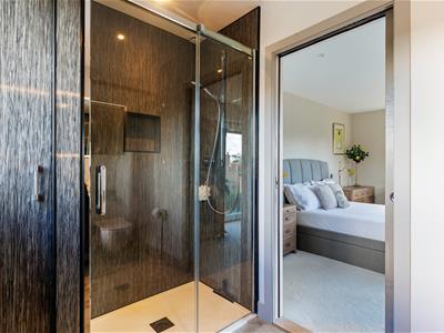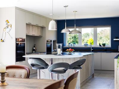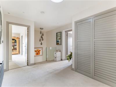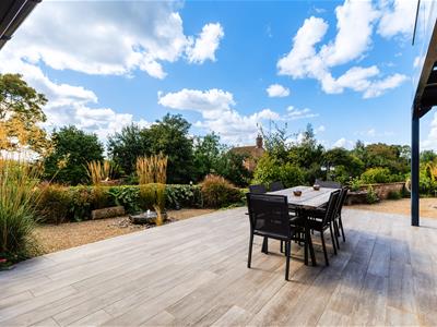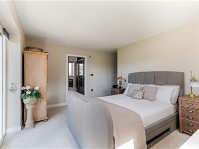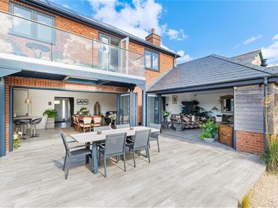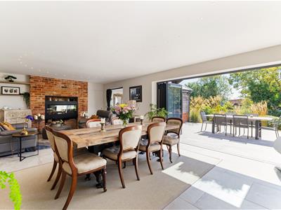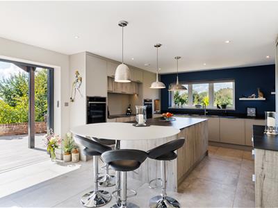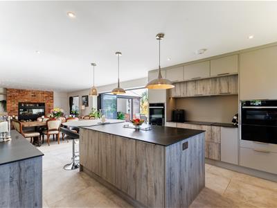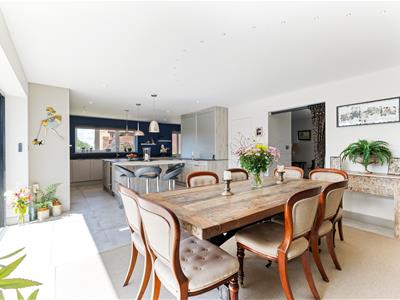 A grand entrance hall sets the tone, leading to a contemporary downstairs shower room, a separate utility, and an outstanding open-plan kitchen/dining/family room that forms the true heart of the home. This expansive space has been carefully designed to balance style and functionality, featuring sleek cabinetry, a full range of integrated appliances including a double oven, wine cooler, Quooker tap for instant boiling and filtered water, induction hob, and two dishwashers. A central island provides both a generous workspace and breakfast bar, while a discreet pantry keeps everything neatly organised. The dining area is bathed in natural light, with bifold doors opening directly onto a private, sunny patio and landscaped garden.