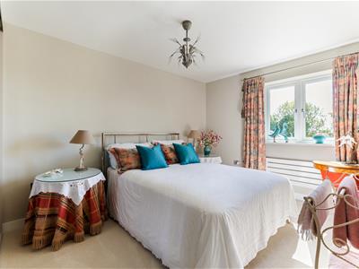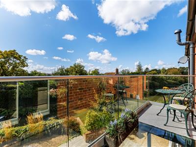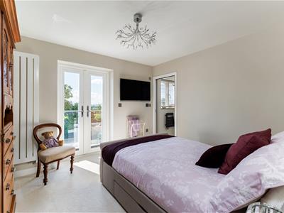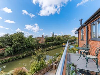 Upstairs, the principal bedroom features built-in wardrobes, an ensuite, and French doors with canal views. There are three further double bedrooms, one with an ensuite and glass balcony, plus a family bathroom with roll-top bath and separate shower.