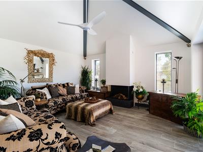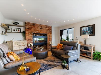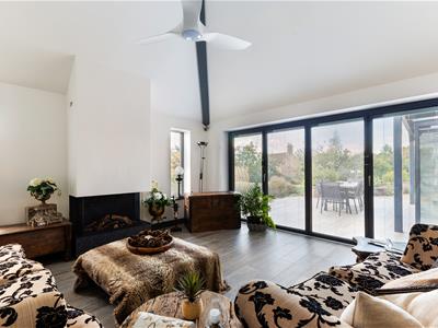 The sitting area, centred around a stylish electric fireplace, flows effortlessly into a separate study/office and a stunning triple-aspect garden room. This additional living space features a gas fireplace with the look and feel of a real open fire, along with bifold doors that further enhance the seamless connection between indoor and outdoor living—perfect for entertaining or relaxed family life.