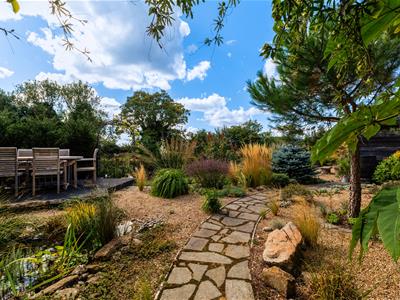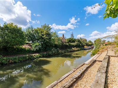 Outside, the south-westerly rear garden is beautifully landscaped and private, with gated access to a terraced bank leading down to the canal. To the front, a walled driveway provides ample parking and leads to a double garage and workshop with electric doors.