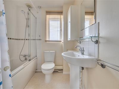 Upstairs, the property offers two bedrooms arranged around a central landing, together with a family bathroom fitted with a bath and overhead shower.