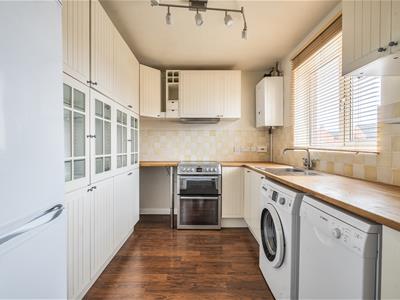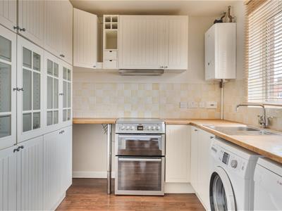 The kitchen is positioned to the front of the property and is well arranged, offering a range of cupboard and worktop space, with space for appliances, which are included in the sale.