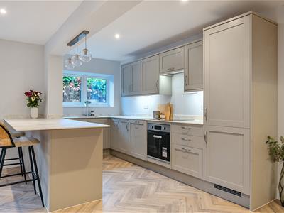 The designer kitchen is fully fitted and centred around a stylish breakfast bar, featuring a full suite of integrated appliances including hob, oven, fridge/freezer, dishwasher, and washing machine.