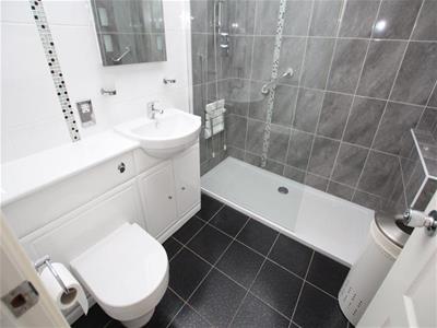 Three piece modern white suite, tiled walls and heated towel rail.