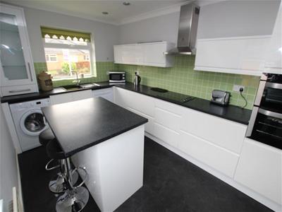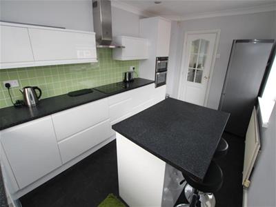 4.67m x 2.74m (15'4" x 9')Modern fitted kitchen having a range of white wall and base units incorporating laminated sink unit, electric double oven and hob, plumbing for auto washer and dishwasher, part tiled walls and radiator.