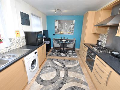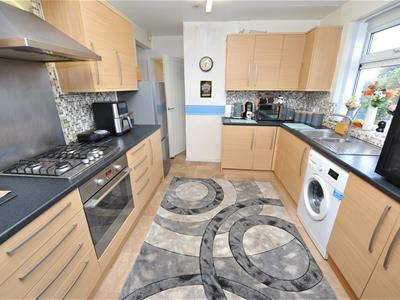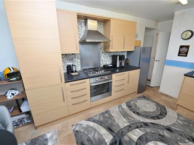2.92m x 4.72m (9'7" x 15'6")Modern oak effect fitted kitchen having a range of wall and base units incorporating stainless steel sink unit, stainless steel oven and hob, dishwasher, plumbing for auto washer, part tiled walls, radiator.