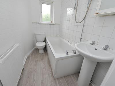 Three piece white suite comprising panelled bath, low flush wc, pedestal wash basin, part tiled and radiator.