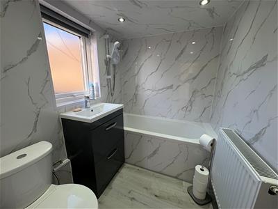 Modern three peice suite comprising; low flush WC, hand wash basin and panel bath with electric shower over. Tiled with radiator and double glazed window.