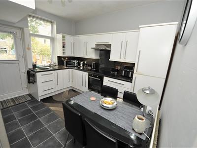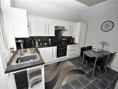 3.35m'' x 3.48m'' (11'0'' x 11'5'')White fitted kitchen having a range of wall and base units incorporating stainless steel sink unit, electric oven & hob and radiator.