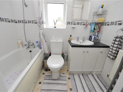 Three piece suite comprising panel bath, low flush wc, pedestal wash basin, tiled walls and radiator.