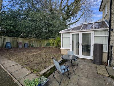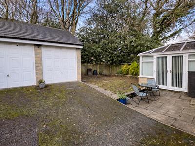 Garden to front and rear with ample driveway parking to side, leading to a detached garage.