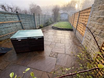 3.35m x 2.92m (11' x 9'7")Modern fitted kitchen having a range of wall and base units incorporating electric oven and recently fitted induction hob, wine cooler, tiled floor, upvc French doors to rear garden.