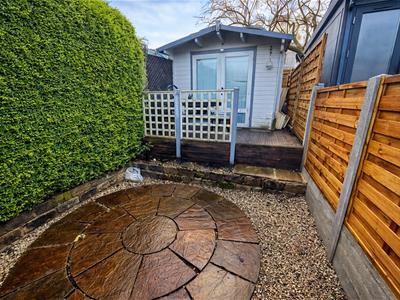 To the outside there is a paved front garden, together with a much larger landscaped garden to the rear with summer house.