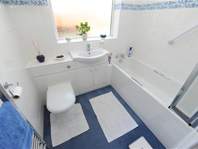 Modern three piece suite comprising panel bath, pedestal wash basin, low flush wc, tiled walls and heated towel rail.