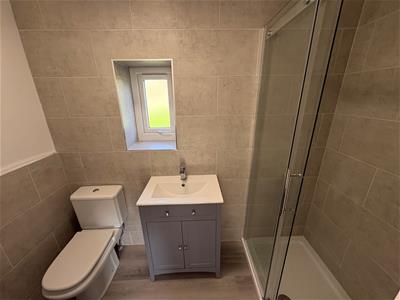 Modern three piece suite comprising shower cubicle, vanity sink unit, low suite wc, towel radiator, double glazed window and part tiled walls.
