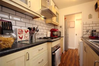 KITCHEN7' 8" x 6' 0" (2.35m x 1.83m) Fitted with a range of units in a light pine effect above and below areas of easy clean work surfaces inset to which is a 1 1/2 bowl stainless steel sink with chrome mixer tap. Also fitted is a four ring gas hob, a single electric oven with stainless steel chimney style extractor over, plumbing for an automatic washing machine, wood effect vinyl flooring, subway style tiling to splash back areas, a upvc double glazed window viewing to the side of the property and an open door way to the;