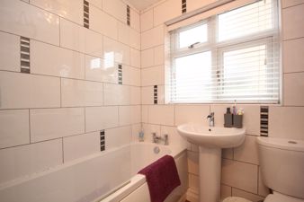 BATHROOM5' 11" x 5' 5" (1.82m x 1.66m) Being fully tiled and fitted with a suite in white comprising of a panelled bath with fountain chrome mixer tap and tritan electric shower over, a pedestal wash hand basin with fountain chrome mixer tap and a low flush toilet. Also fitted is a chrome central heated towel rail, wood effect vinyl flooring, an extractor fan to the ceiling and a upvc double glazed window viewing to the rear of the property.