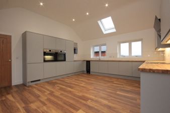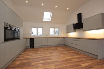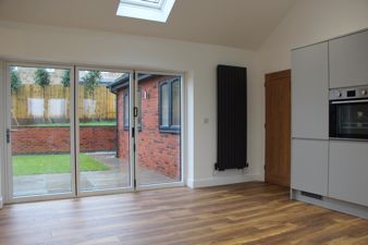 DININGKITCHEN17' 7" x 15' 7" (5.36m x 4.75m) Fitted with a range of units in a matt gray above and below areas of easy clean butchers block style solid oak work surfaces inset to which is grey composite sink with chrome mixer tap. There are integrated appliances with include two single ovens, an electric induction five ring hob with modern glass extractor above, a microwave, dishwasher, fridge freezer and wine chiller. Also fitted is a vertical central heating radiator, Hickory laminate flooring, tilling to splash back areas, a vaulted ceiling with spot lights and Velux's to the front and rear, the upvc double glazed bi fold doors opening to the rear garden and two further upvc double glazed windows viewing to the front of the property. From the Dining Kitchen is a double door way to the;