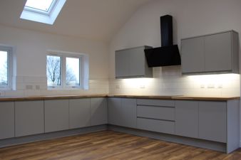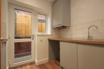 UTILITYROOM8' 0" x 5' 7" (2.44m x 1.72m) Having floor units in a matt grey below areas of easy clean butchers block style work surfaces inset to which is stainless steel sink with chrome mixer tap. Also fitted is plumbing for an automatic washing machine, the Ideal Instinct combination boiler, Hickory laminate flooring, tiling to splash back areas, an extractor fan and spot lights to the ceiling, a upvc double glazed window viewing to the side of the property and the upvc double glazed door opening to the same.