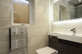 ENSUITE7' 4" x 3' 9" (2.26m x 1.15m) Being fully tiled and fitted with a suite in white comprising of an enclosed shower cubicle with thermostatic mixer valve shower with waterfall head and hand held shower, a wall hung vanity unit with white sink and waterfall chrome mixer tap and a low flush toilet. Also fitted is a chrome electric towel rail, an extractor and spot lights to the ceiling, a LED mirror and a upvc double glazed window viewing to the side of the property.