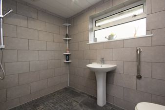 WETROOM8' 6" x 5' 10" (2.61m x 1.80m) Being fully tiled and fitted with a suite in white comprising of a double walk in shower cubicle with thermostatic mixer valve shower with waterfall head, a pedestal wash hand basin and low flush toilet. Also fitted is a chrome central heated towel rail, an extractor fan to the ceiling, spot lights to the ceiling with PIR sensor and a upvc double glazed window viewing to the side of the property.