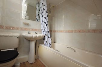 BATHROOM6' 0" x 5' 10" (1.84m x 1.79m) Being fully tiled and fitted with a suite in champagne comprising of a panelled bath with shower attachment to the taps, a pedestal wash hand basin and a low flush toilet. Also fitted is a central heating radiator and a upvc double glazed window viewing to the front of the property.