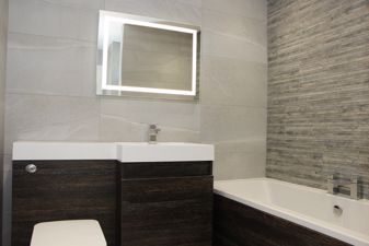 FAMILYBATHROOM8' 5" x 5' 10" (2.59m x 1.79m) Being tiled and having a white suite comprising of a tiled panelled bath with chrome mixer tap and over head designer shower with glass screen, a low flush toilet, chrome mixer tap & complimentary vanity unit and a feature heated mirror above. Also fitted with a chrome heated towel rail, extractor fan, spot lights to the ceiling and motion sensor floor spot lights.