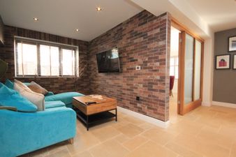 KITCHEN17' 6" x 11' 1" (5.34m x 3.38m) Fitted with a range of units in a matt grey above and below areas of easy clean work surfaces with glass splash backs inset to which is a 1 1/2 bowl composite sink with chrome instant boiling water tap. The integral appliances include two NEFF single ovens, a steam oven and microwave, a Bosch dishwasher and Bosch fridge freezer. There is a central island and breakfast bar inset to which is the integrated NEFF induction hob with ceiling extractor above and wine cooler. The Kitchen further benefits from limestone flooring with under floor heating, spot lights to the ceiling, over cabinet LED lighting, plinth lighting and a upvc double glazed window viewing to the front of the property. From here the Kitchen leads to the;