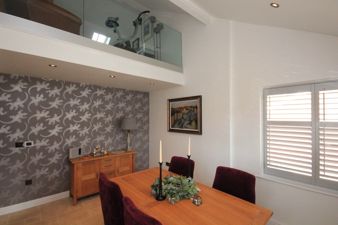 DININGROOM13' 4" x 10' 1" (4.08m x 3.08m) Having a double height ceiling and looking up to the mezzanine level Study/Relaxation Room this room benefits from limestone flooring with under floor heating, spot lights to the ceiling, pale grey shutters to the aluminum double glazed window that views to the front of the property.