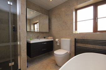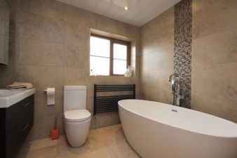 FAMILYBATHROOM7' 2" x 10' 0" (2.19m x 3.06m reducing to 2.56m) Being fully tiled and fitted with a suite in white comprising of a free standing oval bath with chrome floor standing tap and shower attachment, a wall hung vanity unit with wash hand basin and chrome mixer tap, low flush toilet and enclosed shower cubicle with modern Aqualisa shower with waterfall head. There is a black central heated towel rail, a tiled ceramic floor, an extractor fan, upvc cladding and spot lights to the ceiling, glass mirrored cabinet to the wall, sensor lighting and a upvc double glazed window viewing to the rear of the property.