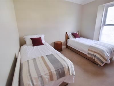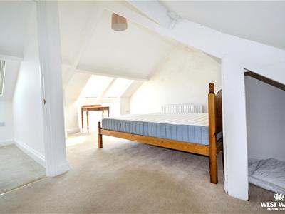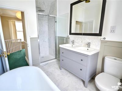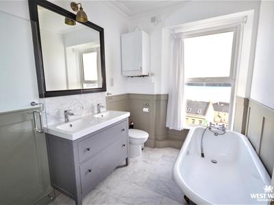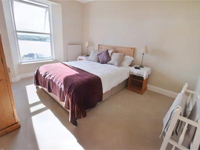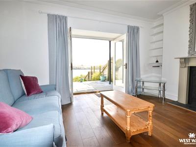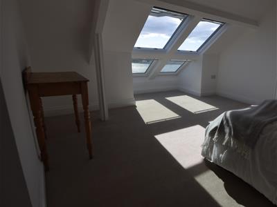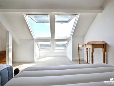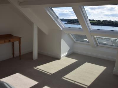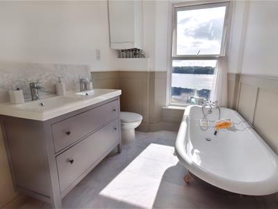 The first floor offers two double bedrooms and a family bathroom, complete with marble tiles, a rain shower, double sink, and a freestanding clawfoot bath. Both the rear bedroom and the bathroom benefit from the estuary views. On the second floor, there is a further double bedroom with Velux windows opening up to views upriver.