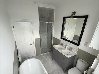 The lower ground floor offers versatile space, including a living room with high ceilings, a feature fireplace, and French doors opening to the southeast-facing garden. There is also an additional bedroom and a shower/utility room, providing flexible accommodation ideal for guests, home working, or multi-generational living.