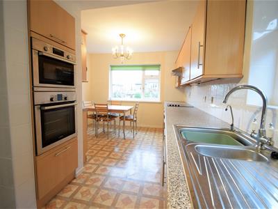 5.87m max long x 3.20m max, reducing to 2.13m (19'Tile effect vinyl flooring, part tiled walls with remainder being wallpaper, extensive range of wood fronted kitchen cabinets with laminate worktops, UPVC double glazed window to front, UPVC double glazed window to side, UPVC double glazed door leading out to side access, stainless steel sink and drainer unit with chrome mixer tap, high level built in oven and microwave, utility area to end of kitchen with space for washing machine and tumble dryer, two ceiling light fittings.