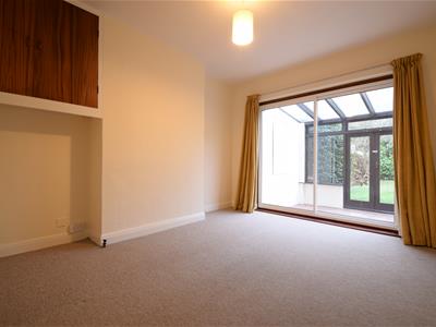 3.91m x 3.35m max into recesses (12'10 x 11'0 maxVarnished wood door, neutral carpet, cream emulsion walls, radiator, high level storage cupboard to recess, double glazed sliding patio door leading out to conservatory, ceiling light fitting, radiator.